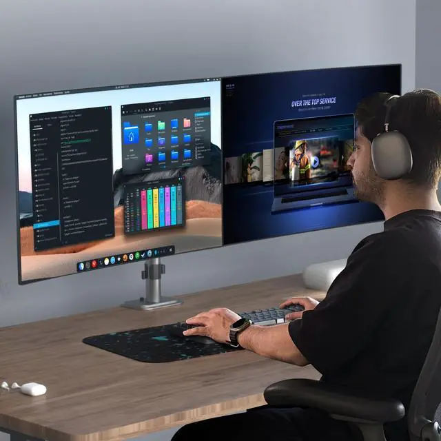 Compatibility - Dual monitor arm desk mount ideal for most screens up to 38"(flat/curved screen), 34" (ultrawide screen). Holds up to 22lbs each with 75x75mm or 100x100mm backside mounting holes. ^^ Fully aticulation - Rotate 360, tilt 90 up and down, swivel 90 left and right, height adjustment along the center pole. ^^ Two install options - C-clamp and optional grommet base (fits desk up to 4" thickness) save your valuable desk space. ^^ Integrated cable management - Keeps your desk tidy and clean by organizing your power and AV cables in detachable cable clips.
