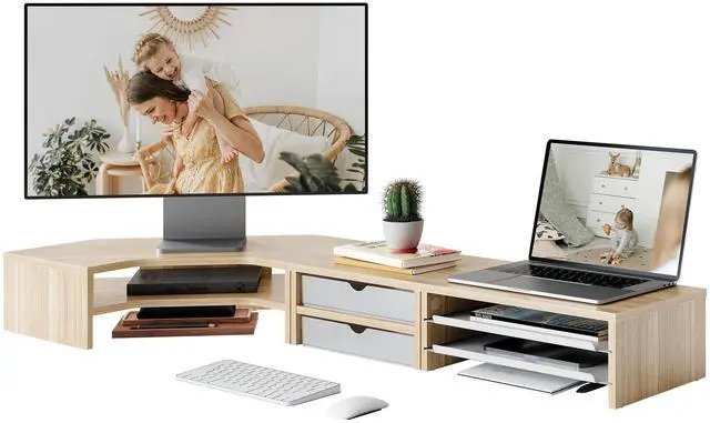 Empower Your Productivity & Creativity: Fenge 43.8 inch extra large dual monitor stand designed for peak productivity. Its expansive surface easily fits two 27-inch screens side-by-side, and elevating your screens 5.3 inches, Fenge triangle monitor shelf helps align your line of sight with the display center. effectively reducing neck and shoulder strain during long working hours ^^ 15 Minutes to