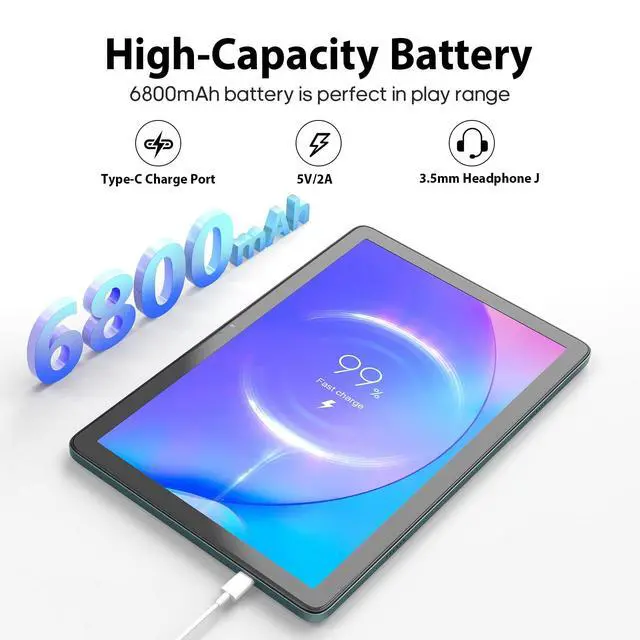 ^^ 8GB+128GB Large Capacity Android 14 tablet is equipped with (4GB+4GB) RAM and 128GB ROM. You can fully enjoy without worrying about running out of space. Supporting TF Card to extende up to 512GB. ^^ 6800mAh Long-lasting Battery Reading tablet is equipped with 6800mAh battery, this 10-inch tablet will effortlessly provide you with 5 to 8 hours of support for reading, browsing, watching movies, playing games and and listening to music.