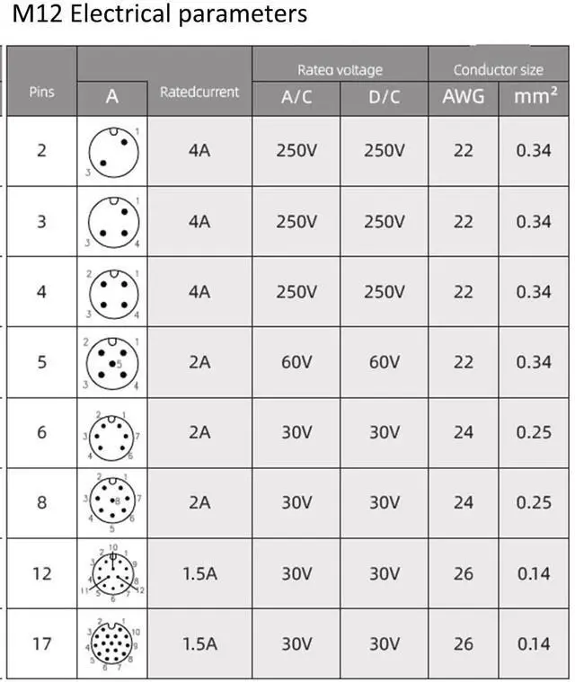 ^^ Cable Lengths: 1M-50M. (We can customize with other length, please contact us if you need). ^^ M12 circular connector is designed for washdown and corrosive environments, primarily used in factory automation applications for actuators, sensors, industrial ethernet, and Fieldbus. ^^ M12 Series with Ip67/68 Rating, Provides with 2, 3, 4, 5, 6, 8, 12, 17 Contacts, Different Pin Match Specific Applications. E. g, Sensor and Power Applications Require 3 or 4 Pins; Profinet and Ethernet Require 4 or 8 Pin Counts; Fieldbus, Can Bus and Devicenet Typically Use 4 or 5 Pin Counts; and Signal Requirements Usually Employ 12 Pins.