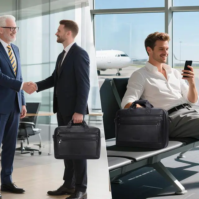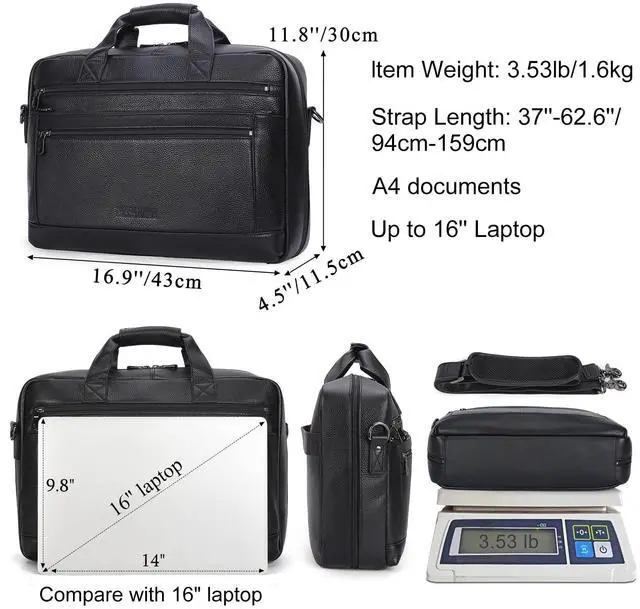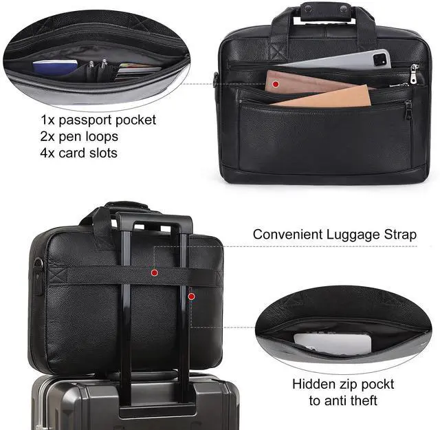 Multi Purpose Briefcase This black leather brief case for men is designed for business meeting, customer visits, daily commuting, or short trip. It has a removable shoulder strap to meet different using needs as leather attache case, cross body messenger bag, single shoulder bag. It is a good gift for husband, father, friends on Christmas, anniversary, valentines day, birthday, father's day. ^^ Organized Structures with Bottle HolderThe leather laptop briefcase is featured with 18 partitions including easy access main compartment with 5 padded dividers, working as cushions for 16 laptop & 11 tablet, holders for small water bottle, mouse, mobile phone; 3 front zipper pockets with 4 card slots, 2 pen loops, 1 passport pouch; 1 back zipper pocket hidden under luggage strap to anti theft.