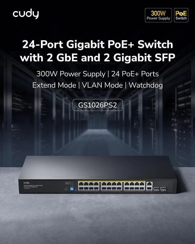 24 x GbE PoE+ 300W, 2 Gigabit Uplink, 2