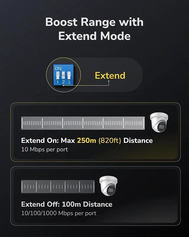 VLAN Mode: CCTV function can extend power supply distance (PoE) up to 250m, VLAN mode isolate the PoE+ ports from each other, which can reduce network maintenance costs. ^^ Desktop and