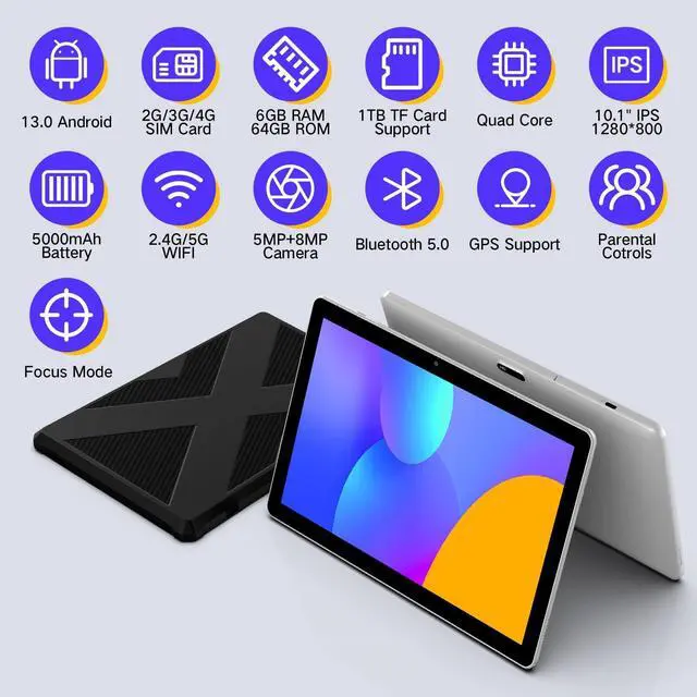 Tablet 10.1 inch Android 13 Tablets, WiFi Tablet, 4G Cellular Tablets with SIM Card Slot, 6GB+64GB, Support 1TB Expand, Tablet with Case, 5MP+8MP GPS SMOOTH OPERATIONThe latest tablet comes with Android 13, featuring 6GB RAM and a high-performance quad-core processor to ensure fast and smooth performance. Whether for work, reading, studying, or entertainment, this 10.1 -inch GMS-certified tablet perfectly meets your daily needs. DUAL NETWORK FUNCTIONALITYThis unlocked 4G cellular tablet is equipped with a SIM card slot, allowing you to stay connected to the world through mobile networks even in environments without WiFi signals (Supporting 2G, 3G, and 4G networks).