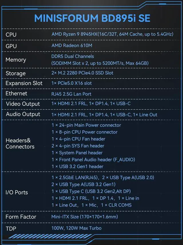 Powerful PerformanceMINISFORUM BD895i SE Motherboard comes with Ryzen series laptop processor AMD Ryzen 9 8945HX. It has 16 cores based on Zen 4 architecture. With 16 Cores and 32 Threads, the standard clock speed is 2.5GH z, and the max boost speed is up to 5.4GH z. Whether you're assembling a compact gaming system, a home theater, or a content creation workstation, the BD895i SE provides a solid, future-proof base for your projects. ^^ 8K@60Hz Video OutpusThis motherboard has three video outputs, one USB-C supports 8K@60Hz and the HDMI&DP 1.4 support 4K@60hz.