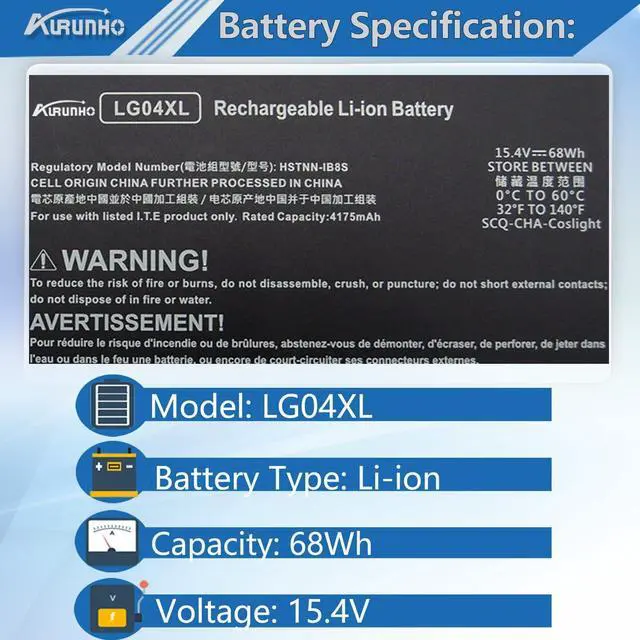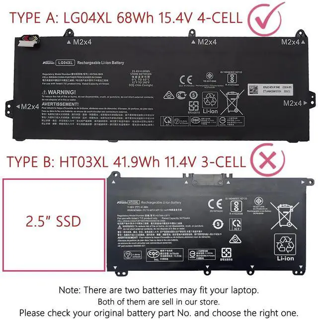 (Important Note: There are two batteries may fit your laptop (LG04XL 68Wh 15.4V 4-Cell) and (HT03XL 41.9W h 11.4V 3-Cell ). Both of them are sell in our store. HP Pavilion 15-cs Laptop with a 2.5 SSD nearby that fits 41Wh HT03XL. Else, it fits LG04XL. Please check your original battery part No. and choose the right one. ) ^^ Compatible P/N LG04XL LG04068XL HSTNN-IB8S L32535-1C1 L32654-005 L32535-141.