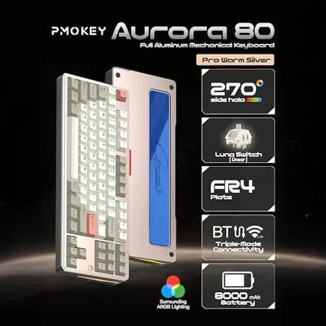 Aurora 80 supports tri-mode connectivity USB wired, BT and 2.4G wireless allowing easy switching between multiple devices for office work and everyday use. A built-in 8000mAh battery provides extended wireless operation with fewer charging interruptions. With its combination of metal construction, refined acoustics, and practical wireless features, PMO Aurora 80 is an ideal choice for users looking for a reliable, well-built mechanical keyboard with strong value.
