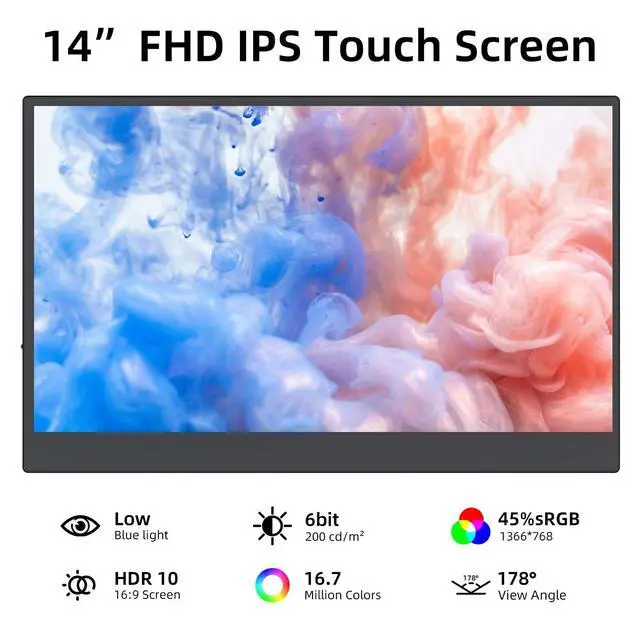 Crisp Visuals & Smooth Performance Enjoy vibrant colors and fluid motion with the 14"display (1366x768 resolution) and 60Hz refresh rate, perfect for streaming shows, editing spreadsheets, or playing casual games. The mini monitor's compact size doesn't compromise on clarityyou'll love how it enhances productivity without taking up too much desk space. ^^ Ultra-Portable Design for On-The-Go Use Laptop screen extender slim at 0.4" and weighing 1.1 lbs, dual speakers, separate portable stand, this small monitor is your ideal travel companion. The lightweight build makes it easy to carry alongside your laptop, while the 14" screen provides ample space for editing documents, watching movies, or extending your workspace.