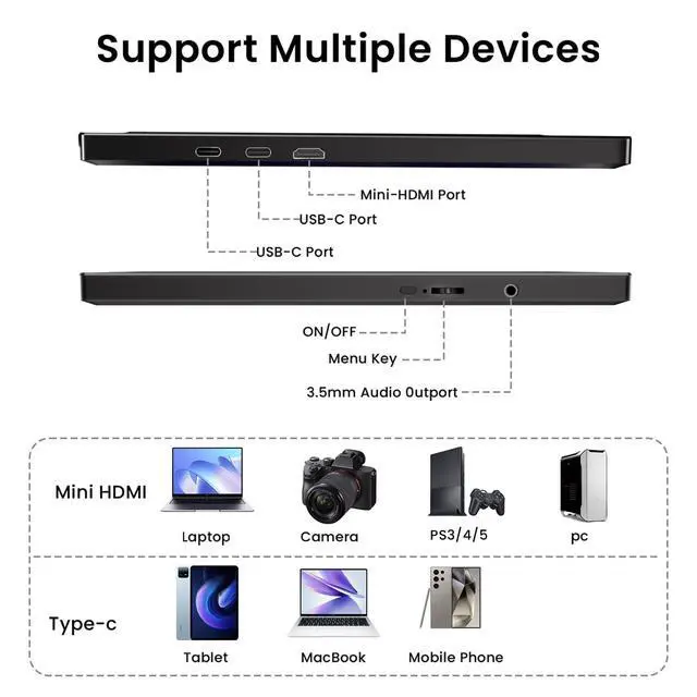 ^^ Plug & Play Compatibility for All Devices This portable monitor liminates the hassle of driverssimply connect via HDMI or USB-C to your Steam Deck, Switch, Xbox, PS5, laptop, iPhone15/16, or PC and start using it instantly. Perfect for gamers who want to extend their console screen on the go, remote workers needing a dual display, or students multitasking. With 1366x768 resolution and 60Hz refresh rate, it delivers clear visuals for work, study, or gaming. ^^ Versatile Connectivity with Multiple Ports Equipped with 2 USB-C ports and 1 HDMI port, this computer monitor adapts to any device.