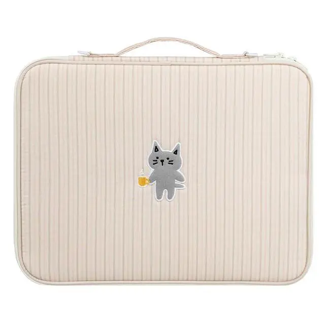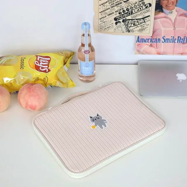 [Charming Stripe Design] Vintage-inspired striped fabric with playful color combinations, making your laptop pouch both stylish and practical ^^ [Soft Cushion Lining] A gentle sponge layer between the outer and inner fabric helps protect your device while adding a comfortable feel ^^ [Organized Storage] Interior mesh pocket and pencil holder allow for neat storage of devices and daily essentials ^^ [Convenient to Carry] Designed with a sturdy top handle and a side D-ring, so you can easily attach keychains or charms ^^ [Smooth Wide Zipper] Wide-opening zipper makes access easy without snagging, offering ample space for your laptop and accessories
