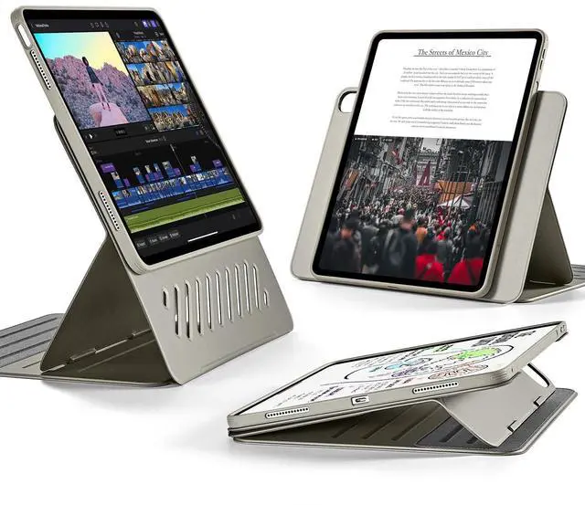Ultra-stable Stand: wide support brackets magnetically lock into grooves in the base to give you superior stability, even when using your iPad Air on your lap ^^ Raised