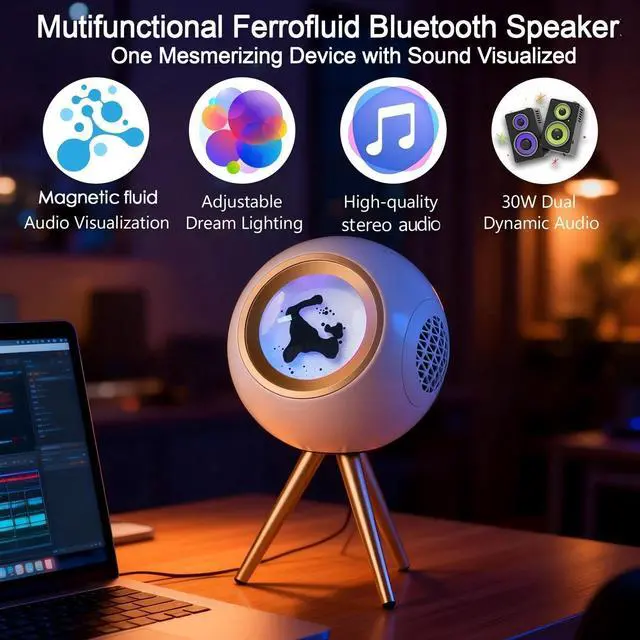 Novel Venom Speaker Inspired by the ferrofluid substance in the Marvel movie "Venom", Venom ferrofluid speaker that is sleek and modern, is in response to external sounds and music, creating a captivating audio visual experience, making it an ideal decoration to your home, office or party ^^ Vibrant Dreamy LightingThe Ferrofluid Music Rhythm Visualizer features built-in RGB lights that automatically change colors. You can also switch to your favorite color or adjust the light brightness by touch the "Light" icon. It will become a unique decorative light on your desktop ^^ Dual Channel Stereo SpeakerThanks to dual channel speakers, the desk ferrofluid speakers for computer delivers surprisingly loud and balanced sound, complete with rich bass and clear soundit fills rooms well, making it perfect for music lovers or livening up party vibes as desk speakers, pc speakers or computer speakers ^^ TWS-360 Stereo FunctionTWS-360 Stereo pairs two ferrofluid speakers wirelessly for a complete 360 soundstage all-encompassing sound experienceperfect for home theater, parties, or wherever life takes you ^^ Suitable for Multiple ScenariosAll-in-one magnetic fluid audio visualizer can be used as a music companion and Bluetooth computer speakers, a creative desk toy, a ferrofluid display, a stress-relief toy, a ferrofluid dancing lamp, and even as a piano metronome.