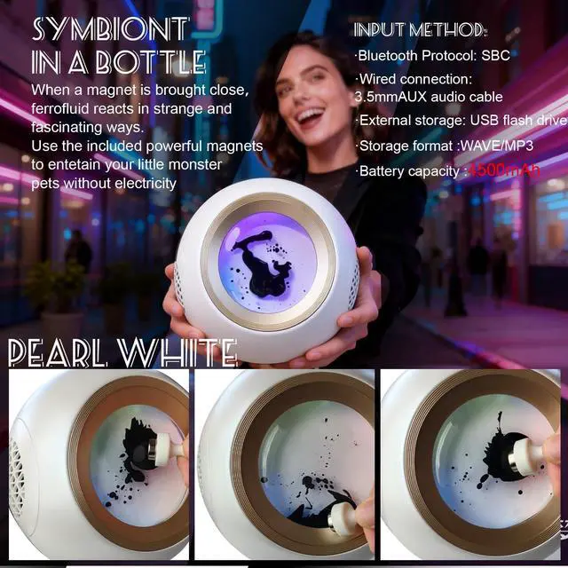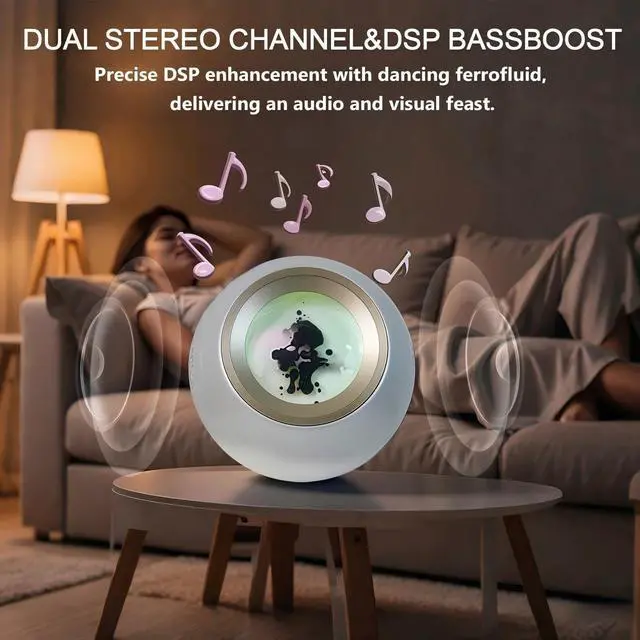 Enjoy your favorite tunes while marveling at the dynamic display ^^ NoteThe original design of this updated ferrofluid speaker will retain bubbles of different sizes. The bubbles are used to buffer the pressure inside the glass bottle and prevent it breaking. And please don't use the product at high temperature, otherwise it will easily cause the bottle loaded with ferrofluid to break