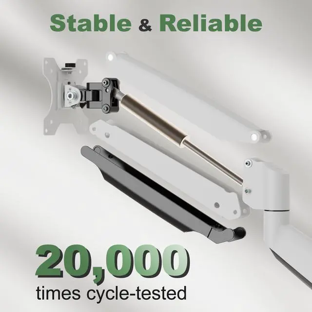 [Ultrawide Display Compatibility] UPGRAVITY white ultrawide monitor arm fits most 13"-35" heavy duty flat & curved computer screen with VESA patterns of 75x75mm and 100x100mm. The unique color will add a nice touch to your desktop setup. ^^ [Higher & Farther Extension] Thanks to the improved gas spring mechanism, our single monitor mount can be extended forward up to 22.8" and adjusted to a maximum height of 20", making a great addition to your ergonomic standing/sitting workstation. Its upgraded robust construction, made of aerospace-grade aluminum, bears a maximum load capacity of 26.5 pounds.