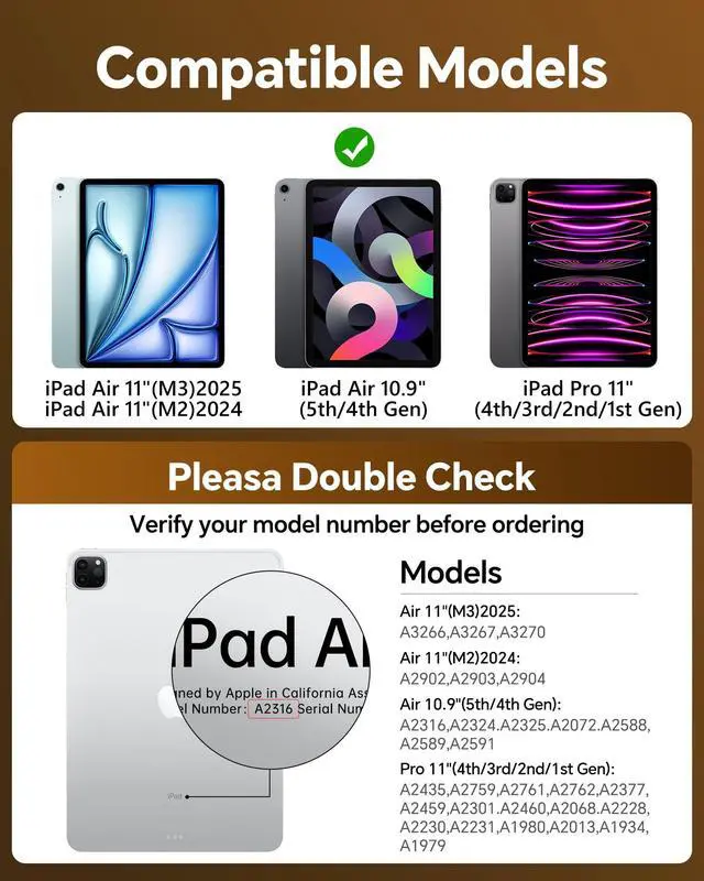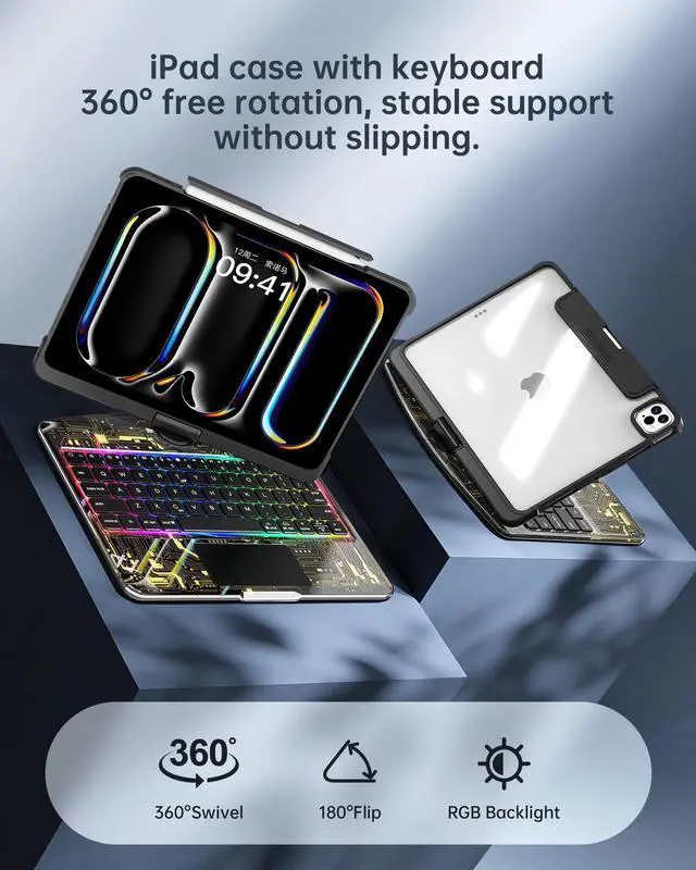 Corresponding model numbers are: A2759, A2435, A2761, A2316, A2324, A2325, A2072, A2377, A2459, A2301, A2460, A2068, A2228, A2230, A2231, A1980, A2013, A1934, and A1979. Please check the model number starting with "A" on the back of your device before ordering to ensure compatibility. This also provides a smoother user experience for the iPad Air 11 Pro 11 Keyboard Case. ^^ [360 Rotatable iPad Air 11-inch Case with Keyboard Stand] The bearing hinge design supports 360 rotation, allowing you to find the most comfortable viewing angle for your iPad keyboard case from any angle. ^^ Keyboard Case Suitable for Convenient Use in Multiple ScenariosWhether working from home, studying on campus, or traveling outdoors, this iPad 11th generation case with keyboard can be used seamlessly. ^^ Comfortable Typing and Stylish DesignThe iPad 11-inch case with keyboard features soft-touch, silent keys, making typing comfortable and effortless, reducing fatigue even after prolonged use. It also boasts multi-color backlighting with soft, non-glaring light, combining cool practicality with a stylish look. ^^ Fast Charging & Long Battery LifeIt only takes 2 hours to fully charge and is designed for long battery life.