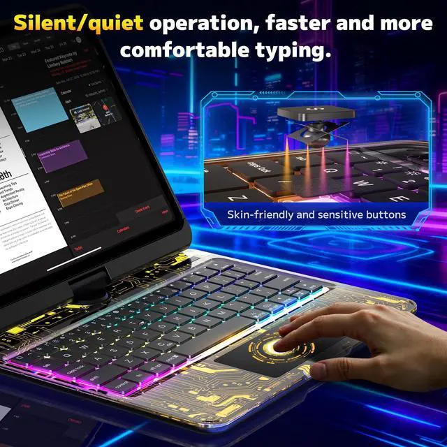 No need to frequently plug and unplug the charging cable, completely say goodbye to battery anxiety, and keep your iPad Case with Keyboard in high-efficiency use at all times. ^^ 7-Color Backlit Wireless KeyboardFeatures a 7-color backlit wireless keyboard with a protective case, allowing you to switch between multiple colors such as red, blue, and green, and offers adjustable brightness levels. ^^ Anti-slip and Drop-proof DesignFeatures an all-around anti-slip and drop-proof structure with built-in cushioning layers on the edges, effectively resisting daily bumps and accidental drops. The keyboard case backplate fits snugly against the device, ensuring it stays in place whether carried around or used on the go, providing excellent protection for your iPad 11 keyboard case. ^^ [12-Month Extended Warranty] The iPad 11-inch case with keyboard comes with a 12-month extended warranty, supported by a professional after-sales team. Customer service is available 24/7 to provide comprehensive support from purchase and use to after-sales maintenance, eliminating any worries you may have.
