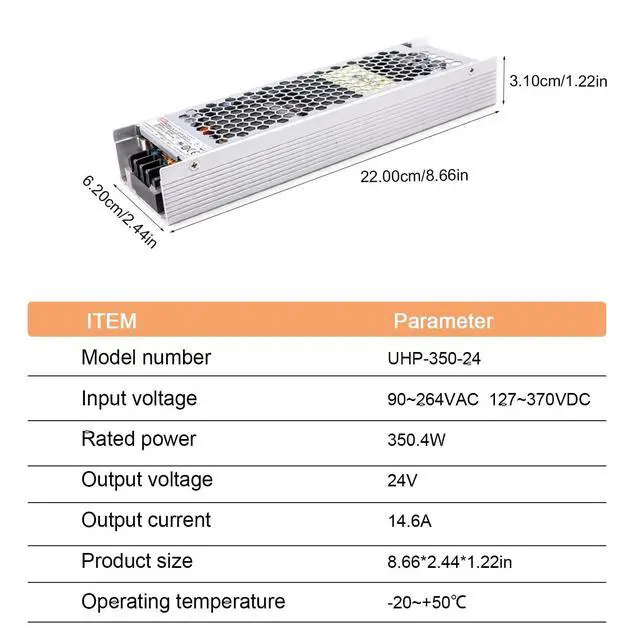 Reliable Industrial Power: The UHP-350-24 delivers 24V, 14.6A, and 350W with a 300VAC surge withstand capability for 5 seconds, ensuring stable output for demanding applications.