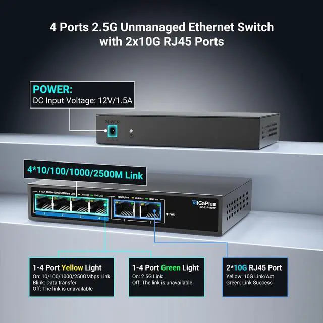 ^^ Plug and Play: Supports 10/100/1000M/ 2.5G auto-sensing on ports 1-4, with auto MDI/MDIX and non-blocking data forwarding support, easy to set up without any configuration or software, providing the best performance for all your devices. This switch provides 2x10G RJ45 ports for high-speed network connections, providing a cost-effective solution for adding 10G link capacity.