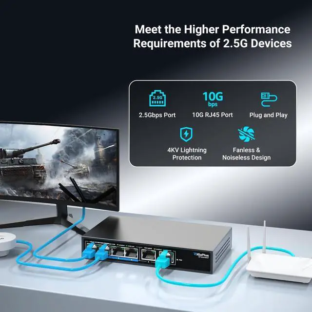 ^^ Stable and Quiet: Rugged metal casing and 6KV lightning protection design make this 2.5G /10G network switch safe to use in a variety of environments. The fanless design reduces power consumption, keeps it quiet, and ensures good heat dissipation and stability of the device. Supports desktop and wall mounting. ^^ Wide
