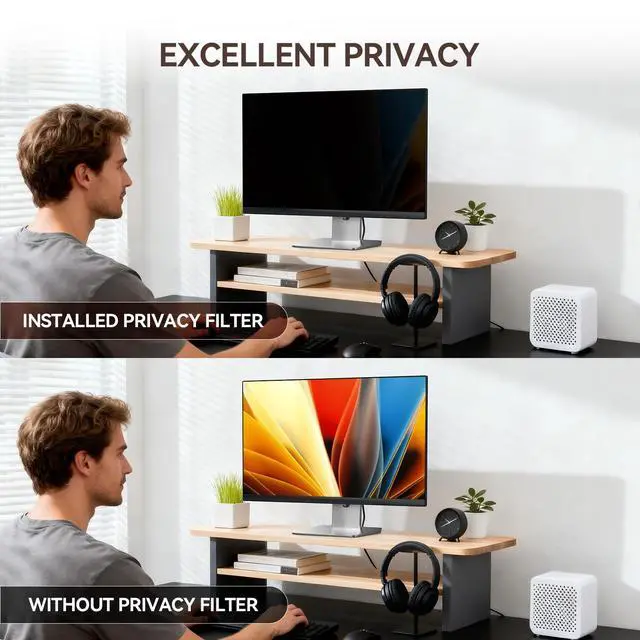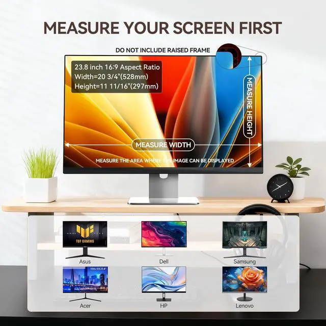 Width: 20 3/4" (528 mm), Height: 11 11/16" (297 mm), Diagonal: 23.8" ( 604.52 mm). Removable installation method-snap-in installation. Suitable for computers with a raised frame, a 16:9 screen aspect ratio and a 23.8 -inch size. Choose the method that suits you, and it can be installed in 20 seconds. Please confirm the width and height measurements for your computer screen before ordering. ^^ [Effective privacy & Anti Glare] Multi-layered film limits viewing angle to +/- 30 degrees while providing a crystal clear screen straight-on, completely prevent others from peeping at your screen. This privacy screen 14 inch is reversible (matte/glossy): Gloss surface enhances privacy, matte surface reduces reflections. ^^ [Protect Screen Also Eyes] The high-quality materials imported from Japan and the process imported from Germany have greatly improved the performance of the privacy screen. High-quality filter layer that can reduce 95% of blue light and 92% of UV light. Matte surface, anti-glare, intercepts part of the reflected light. Anti-scratch layer to avoid scratches from daily use. Protect your screen while protecting your eyesight. ^^ [Perfect for Travel and Open Workspaces]- The Privacy Screen Filter is the ideal solution for healthcare providers, mobile workers, commuters, students, and business travelers. Now you can stay compliant and safeguard sensitive corporate information while working in airplanes, subways, airports, and public areas. ^^ [Lifetime Warranty] Privacy screen Lifetime Warranty money-back guarantee for any reason, save you from the worries of after-sales, if you meet any problems or have any suggestions, please feel free to tell us, and we will help you wholeheartedly. have any suggestions, please feel free to tell us, and we will help you wholeheartedly.