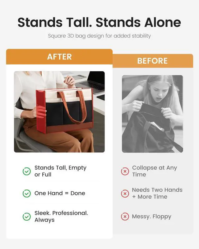 View: The built-in frame design ensures the bag remains upright and stylish even when empty. Combined with a wide rectangular opening, the contents are clearly visible, allowing for quick access and helping you maintain a composed and professional image in any situation. ^^ More Than Just Size, More