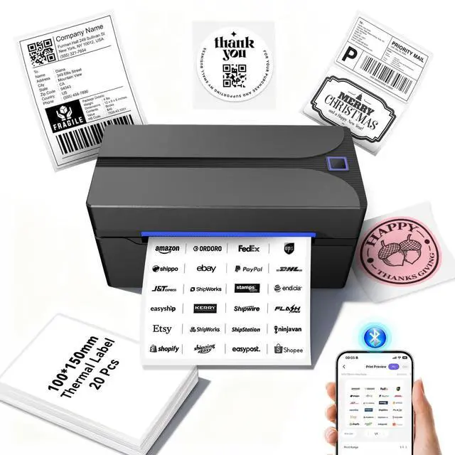Inkless Thermal Shipping Label Printer: This thermal label printer employs thermal printing technology, with a print head lifespan of approximately 1.25 million shipping labels (50KM). Say goodbye to messy ink and costly toner cartridges simply load shipping labels to print crisp, sharp 203 DPI labels. ^^