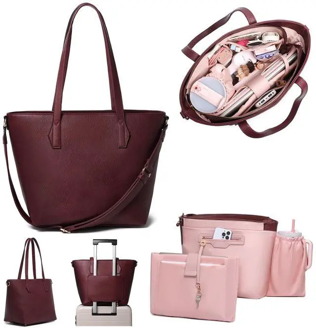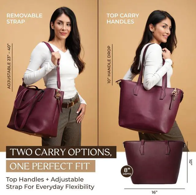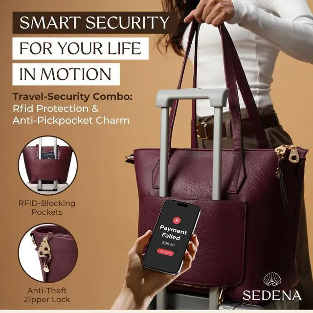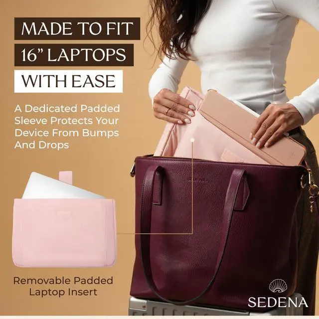 DescriptionThe Sedena Anti-Pickpocket Laptop Tote Bag in Burgundy is designed for women who need a stylish, functional, and secure everyday carry solution. This premium vegan leather work and travel tote includes a detachable padded sleeve that fits up to a 16-inch laptop, plus multiple interior pockets for chargers, cosmetics, notebooks, and other daily essentials. A built-in cupholder fits a 30oz Stanley or water bottle without tipping, while RFID-blocking pockets help protect your cards and passport. The anti-pickpocket zipper system keeps your valuables secure while commuting, shopping, or traveling.