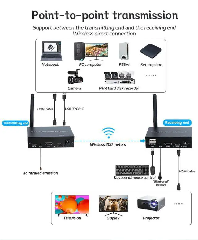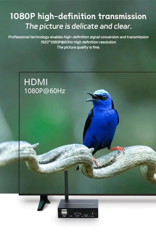 1. IntroductionThis extender uses WiFi to extend high-definition TV signals and USB keyboard and mouse signals up to 200 metres, with a resolution of up to 19201080P@60Hz. It not only breaks the distance limitations of HDMI cables but also eliminates the hassle of wiring, making it more convenient. This HDMI extender uses an HDMI (High-Definition Multimedia Interface) connector. If an HDMI-to-DVI adapter is used, it also supports DVI (Digital Visual Interface) connectors, providing greater flexibility and more options for home theatre systems. It offers multiple solutions for home users, such as high-definition TV sales and demonstrations, set-top boxes, DVD players, projectors, and other devices, as well as applications in space and security fields, data control centres, information dissemination centres, meeting rooms, schools, and corporate training environments.