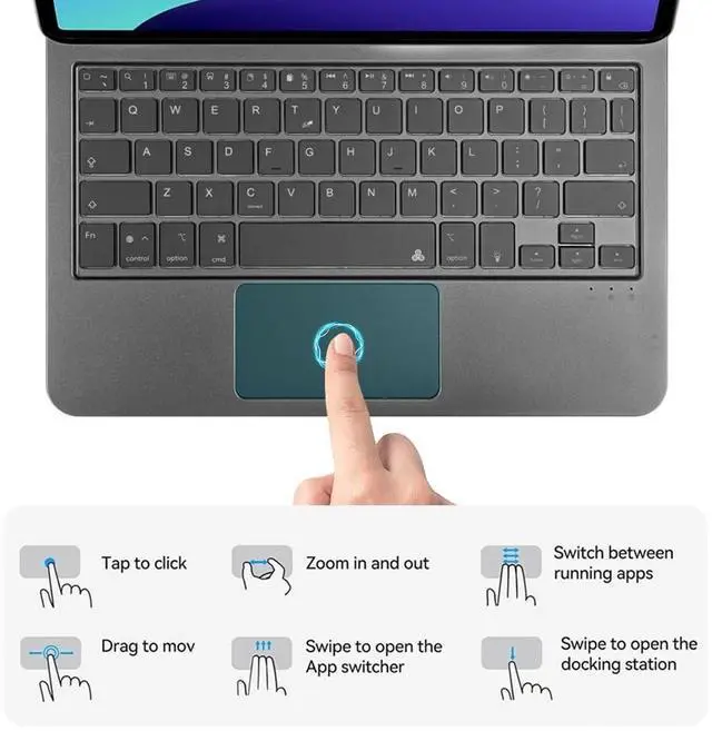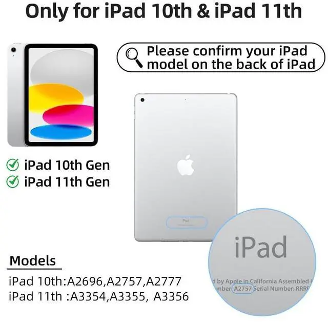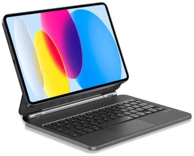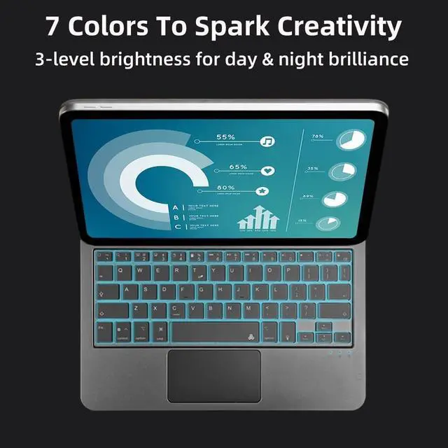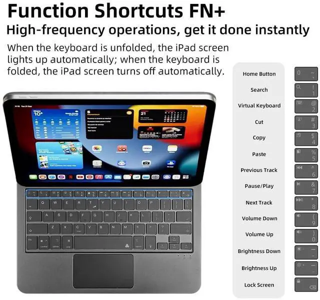 Gen (model numbers: A3354/A3355/A3356) for a snug fit with perfectly aligned ports and buttons Silent scissor keys + 3-level backlight, fit for office workers' scenariosbelow 30dB ultra-quiet typing wont disturb others when researching in libraries, rushing projects in cafes, or taking notes in meeting rooms; 1.2 mm key travel offers comfortable rebound, no fatigue even after 3 hours of continuous report writing; brighten backlight for clear typing in low light, dim it for eye protection during bright commutes, and stay efficient anytime, anywhere 3-level brightness as core + 7 color options as supplement, more practical for officebrighten backlight for clear typing during overtime in low light, dim it for eye protection during business trips in strong light, use medium brightness for daily work; 7 soft colors can be switched to match your mood, combining practicality of efficient office work and desktop aesthetics to enhance immersive work experience Full-function trackpad supports multiple control gestures, swipe/zoom/drag with one touch, doubling operation efficiency; Strong magnetic floating stand, 120 multi-angle adjustment, free switching between typing, viewing and presenting Smart auto wake/sleep, control the iPad with case opening/closing, efficiently save battery power; Bluetooth 5.0 fast pairing, stable connection without delay, no extra apps needed, ready to use once connected