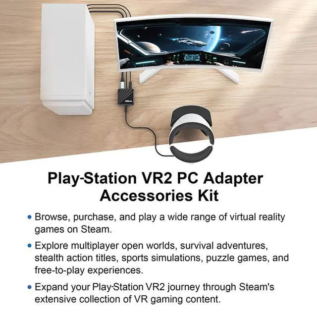 Expand Your Gamming LibraryAccess a new realm of gaming by connecting your VR2 to your Wins PC with our adapter, browse, purchase, and play a wide range of virtual reality games on Steam, explore multiplayer open worlds, survival adventures, stealth action titles, sports simulations, puzzle games, and free-to-play experiences. Expand your VR2 journey through Steam's extensive collection of VR gaming content.