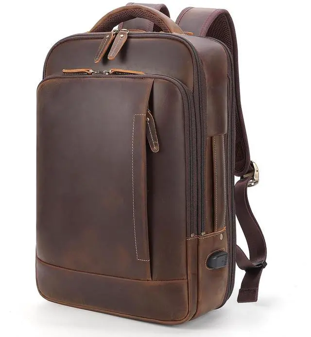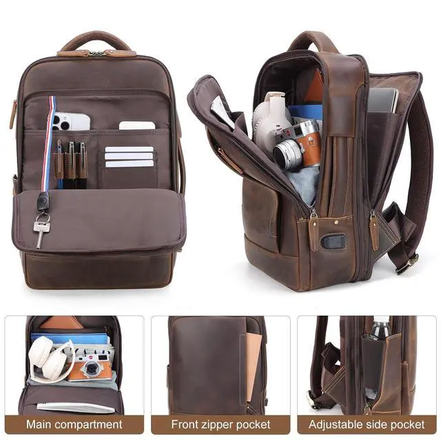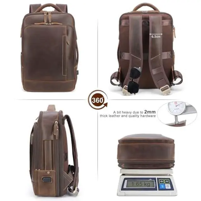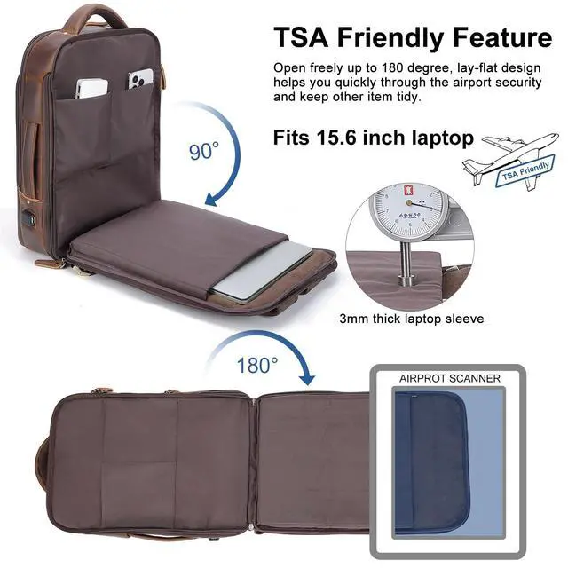 Premium MaterialThis retro leather backpack is made of 2mm thick full grain cowhide leather, which can retain the natural pores and scars of leather. The leather will develops a unique patina over time, adding charm to your backpack and catch the compliments. The sturdy ykk plastic zipper can withstand 1000 times pull test, while reinforced stitching and reliable hardware guarantee durability. ^^ TSA-Approved & USB Charging PortThis TSA-friendly carry on leather backpack opens 180 flat, letting you breeze through airport security without unpacking your tech. The built-in usb a charging cable and external usb a port is a thoughtful touch for on-the-go charging.