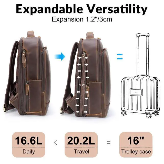 It is the perfect companion for weekends, business travel, short trips and frequent flyers. ^^ Expandable & PracticalExpand from 20L to 25L to meet your commuting or weekend travel needs. Thoughtfully designed breathable pad on the back panel and shoulder straps, providing comfortable to carry throughout all day. The strap on the back to secure the bag to the suitcase, which can ease your burden during travel. ^^ Keep Items OrganizedThis leather laptop backpack features two main compartments, two front zipper pockets, one side pocket, seven inner pockets, three pen holders and three card slots makes organizing belongings a breeze.