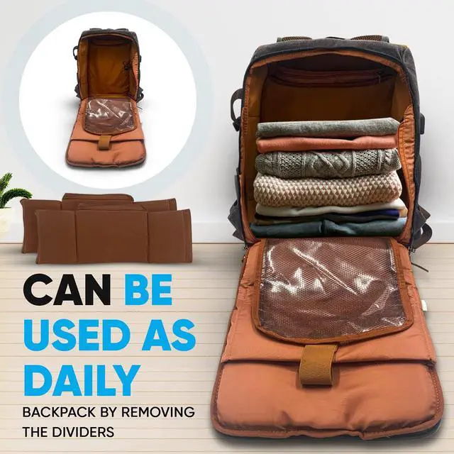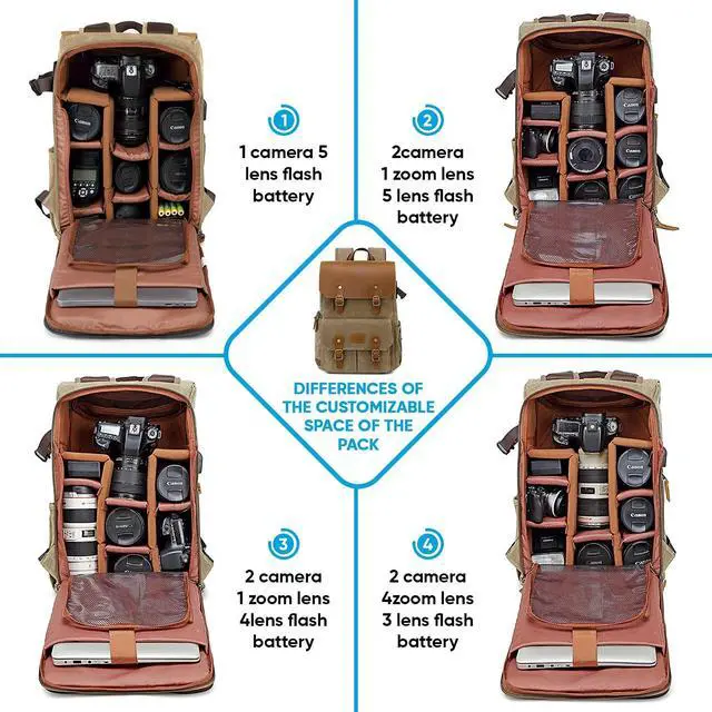 Design For Photographers. With the removable padded dividers, you can easily customize the space of the camera backpack to fit all your gears. The quick side access allows you to capture every beautiful moment. ^^ Large Capacity. The dimensions of the camera backpack are 13 L X 8.5 W X 18 H, Weight 3.75 lbs. It is perfectly to fit 1 DSLR with lens attached, 2 camera, 4 standard lenses, 16-inch laptop in the laptop sleeve and other accessories or personal items such as portable charger. ^^ Vintage Design.