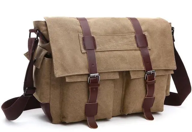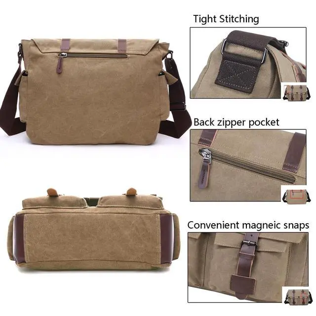 Large Laptop Storage - Fits laptops up to 15.6 inches, documents, and accessories inside a secure main compartment with vintage appeal. ^^ Well-Organized Interior - Features a spacious main zip pocket, two inner slip pockets for phones or chargers, and a zip pocket for valuables. ^^ Multiple External Pockets - Includes a rear zip pocket, two front slip pockets under the flap, and two side pockets for water bottles or accessories. ^^ vintage Canvas - Built from heavy-duty canvas with leather details, offering a classic, timeless, and durable design.