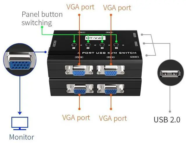 MT-VIKI 460KL, VGA KVM switch 4 ports with 3 USB hub allows 4 computers to share one set of monitor, keyboard, mouse and printer/U disk for video or data. ^^ 4