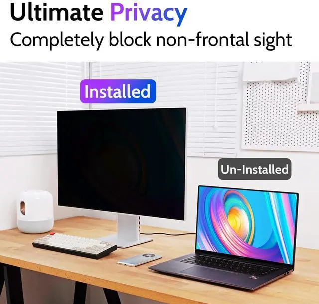 ^^ EFFECTIVE ANTI-GLAREThe anti-glare technology from Germany AG can reduce the glare above 90 and soften the light, so that you will not feel the dazzling reflection in the strong light environment. The 24 inch monitor privacy screen has a unique double-sided structure, the glossy surface has a better anti-peep effect, and the matte surface has a better anti-glare effect. You can choose according to your needs. ^^ STRONG ANTI-BLUE LIGHTFiltering optical materials imported from Japan can reduce 92% of blue light and 98% of UV light, and filter all harmful light emitted from the screen to protect your eyes. The high-transparent and reinforced built-in protective layer not only presents high-definition picture quality, but also protects your screen from scratches. Hurry up and place an order, own privacy screen for computer monitor 24 inch, protect your screen and your eyes. ^^ WIDELY APPLICABLEThe privacy screen filter 24 inch is modeled on a real machine, the size is 1:1 matching, and it is compatible with a 24-inch monitor screen with an aspect ratio of 16:10. Our computer screen privacy filters are perfect for business, students, healthcare workers, and bank workers.