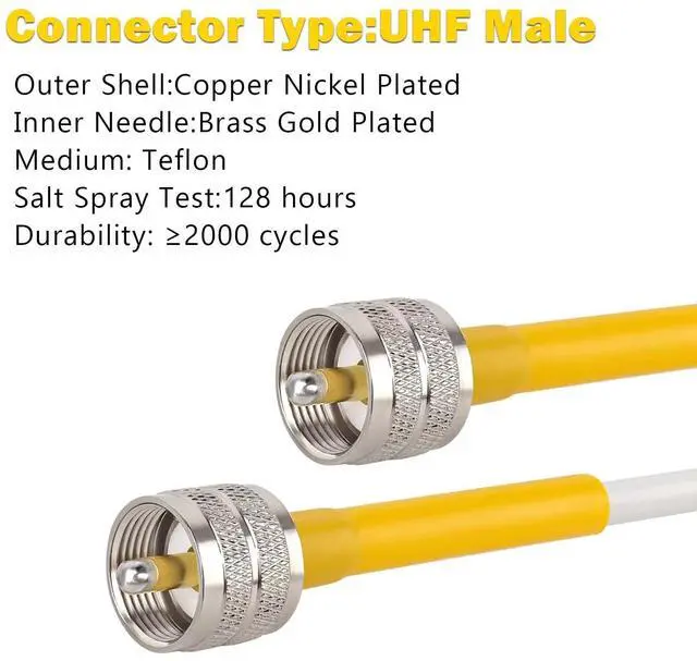 ^^ Premium Materials -- The inner conductor of this cb antenna cable is made of solid copper, and the outer conductor is made of Aluminum foil and tinned copper braid which could maximum protect the signal over large distance. More than 95% shield performance, 95% resistance to EMI and RFI. Waterproof and flexible white PVC jacket allows the cable exposure in outdoor harsh environments. ^^ Stronger Connection -- The length of heat shrink tube that connect the rg8x cable and pl259 male connector is upgraded to 2.2", which can better protect the connector from falling off.