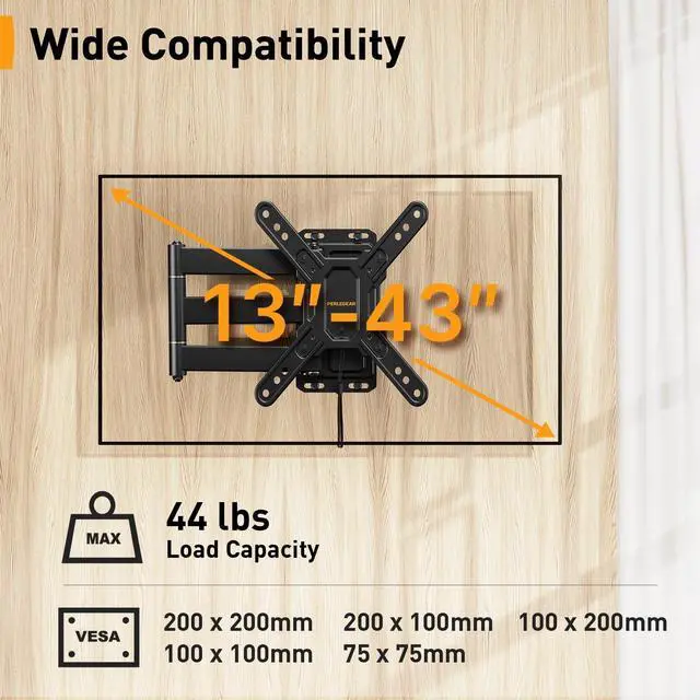 Universial RV TV Mount: The RV TV wall mount fits most 1343 TVs up to 44 lbs with VESA patterns 75x75mm, 100 x 100mm, 100 x 200mm, 200 x 100mm, 200x200mm. And the RV TV mount can be installed on single wood studs, concrete, or brick walls. Please verify the size, weight, and VESA pattern of your TV before purchase. ^^ Pull Cord