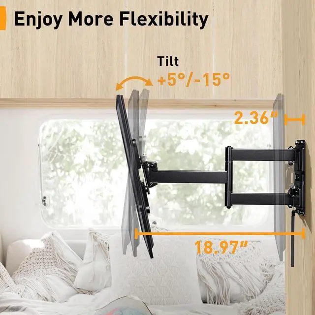 ^^ Enjoy Optimal Viewing: Featuring +/-90 swivel, +5/-15 tilt, and 18.97 arm extension, the RV TV wall mount provides a wide range of motion. And the The RV TV Mount for camper can retract back to 2.36 for space saving. And this tv mount is very suitable for installation in corners. This versatility makes our RV TV mount a game-changer for motorhome entertainment.
