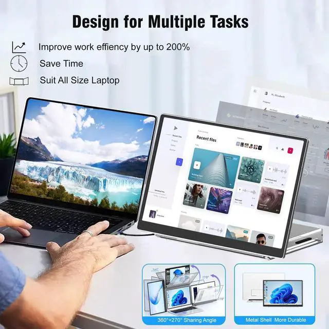 Just make sure your device or laptop has 1 USB-C port (full function), or 1 HDMI +1 USB-A port. ^^ Multiple Use Mode & 210+ 360Sharing Angle -The Extension Laptop Monitor Extender offer multiple display modes(Extend/ Mirror/Landscape/Portrait ). The unique bracket base design support monitor 210+ 360angle sharing(VS other 180-270), allow you customize view angles. Also help you easily share screen to others efficiency communicate. The Lightweight aluminum shell (Vs other plastic) is more durable, better for heat dissipation. ^^ 1920 x 1200P FHD IPS Monitor & Support Independently Adjust-14" Full FHD Portable Travel Dual Second Monitor can be easy take out in backpack.