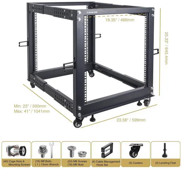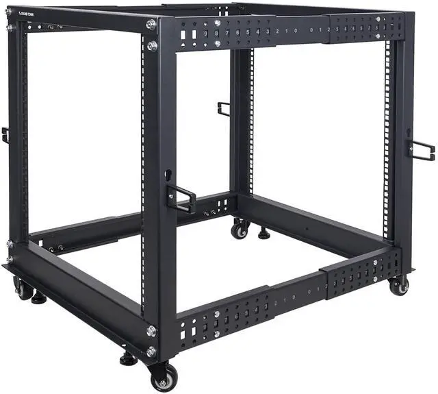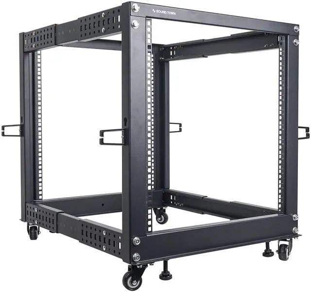 Sound Townas 12U open frame rack with adjustable depth provides fast and easy access to installed PA, server and network equipment. The ST4POF-A12U is a perfect solution for housing and organizing PA or IT equipment in secure environments where maximum air flow is required. The 12U server rack features top-quality cold-rolled steel construction with a black powder-coated finish for enhanced durability. It supports stationary loads up to 1200 lbs. The ST4POF-A12U comes with all the hardware and parts needed for assembly. Once assembled, it provides great airflow, easy access to equipment and cabling.