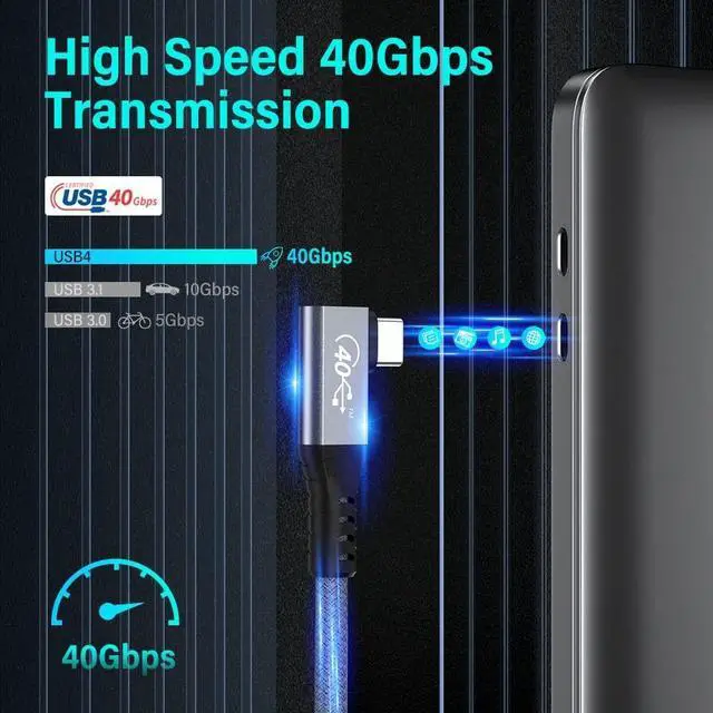 Quality Assurancel: Right Angle USB 4 cable built in powerful E-Marker smart chip, high-end tinned copper core wire and leading production technology to ensure more stable charging and faster transmission. Our USB4 cable has quadruple shielding and tinplate, which can strongly resist EMI/RFI interference and provide the highest fidelity for long-distance data transmission.