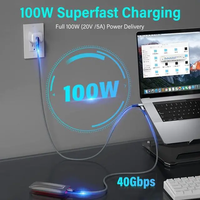 Power Charging&40Gbps Data Transferring: Right angle thunderbolt 4 cable support up 100W 20V/5A PD 3.0 Power Delivery, rapid charging maximum 100W charge when paired up with a compatible charger. 40Gbps data transfers speed, copy 14 hours of HD video or 25, 000 photos within one minute at speeds up to 40Gbps.