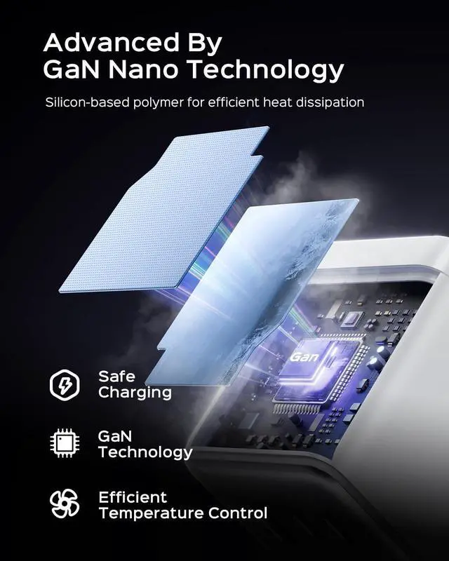 Certified Safety: 40% cooler than traditional chargers thanks to next-gen Gallium Nitride III and thermal safeguards, stays at 113F max during 100W output (safe touch-range). ETL/CSA/UL-certified with high-grade protection Support 100x/sec voltage/current monitoring, Short-circuit/overload auto-shutdown, Flame-retardant casing ^^ Compact &
