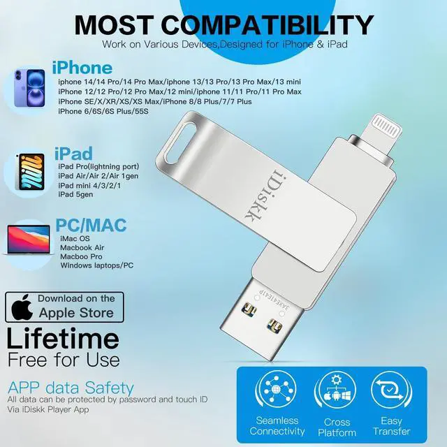 COMPATIBLE DEVICES- iPhone 14 Pro Max, iPhone 14 Pro, iPhone 14 Plus, iPhone 14, iPhone SE (3rd), iPhone 13 Pro Max, iPhone13 Pro, iPhone13, iPhone13Mini, iPhone 12 Pro Max, iPhone 12 Pro, iPhone 12, iPhone 12Mini, iPhone 11 Pro Max, iPhone 11 Pro, iPhone 11, iPhone SE (2nd), iPhone XR, iPhone XS Max, iPhone XS, iPhone X, iPhone 8 Plus, iPhone 8, iPhone 7 Plus, iPhone 7, iPhone SE (1st), iPhone 6S Plus, iPhone 6S, iPhone 6 Plus, iPhone 6, iPhone 5S, iPad 5/6/7/8/9, Mini 2/3/4/5/6 iPad Air Serie, iPad Pro(Lightning connector(iPhone/iPad/iPad Pro Requires iOS 9.0 or later) iPod touch (6th, 7th), Win11/Win10/Win8/Win7, PC, Laptop, Mac Requires macOS 11.0 or later and a Mac ^^ WATCH MOVIES DIRECTLY FROM THE PHOTO STICK -Connect and play, enjoy movies or musics stored in the flash drive when you are on trip or travel, most