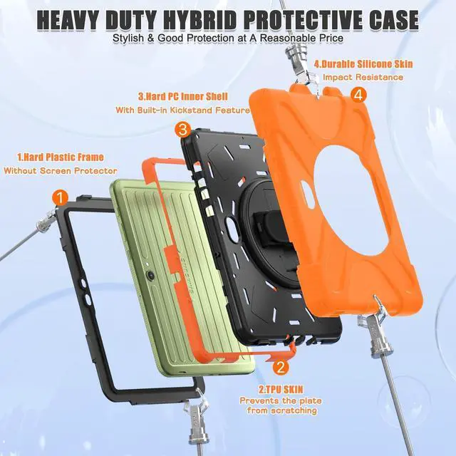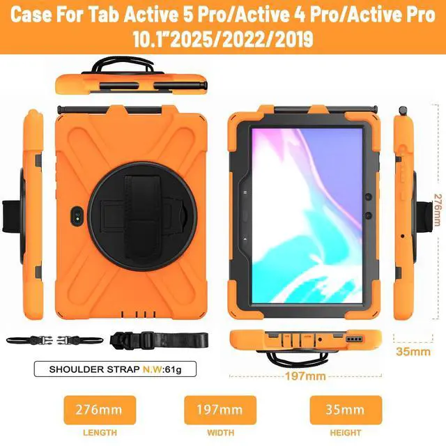 Designed for Samsung Galaxy Tab Active5 PRO (SM-X350/SM-X358) and Samsung Galaxy Tab Active PRO 10.1 Inch (SM-T540/T545/T547) and Samsung Galaxy Tab Active4 PRO (SM-T630/T638) tablet. ^^ Heavy-duty protective case features an advanced triple-layer design combining a polycarbonate hard shell with flexible silicone, engineered to withstand accidental drops, impacts, and shocks. ^^ Cover built with 360 degrees rotatable kickstand for convenience to typing and video watching. ^^ Case built with hand strap Ideal for workers to work with tablet. ^^ Adjustable removable shoulder straps. According to any need, remove the shoulder strap or the length can be easily adjustable, you can carry your tablet like a carrying bag.