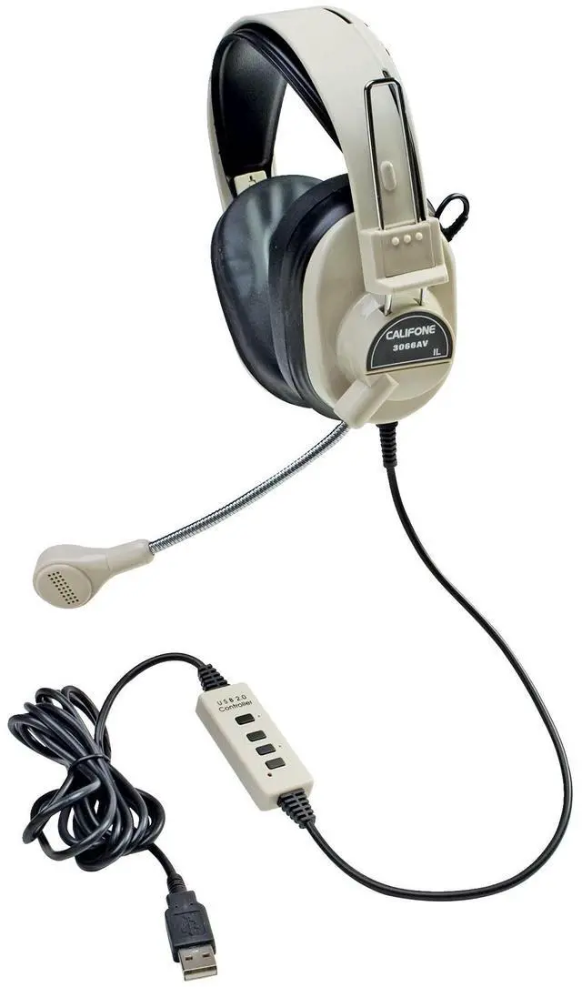 The 3066AV-USB headset is one of Califone's most rugged headsets. The adjustable, plastic headband fits most sizes. Noise-reducing over-ear cups lower external volume and feature slotted baffles for added speaker protection. Leatherette ear cushions add comfort and are replaceable. Gooseneck microphone is noise-reducing, omnidirectional and encased in steel for added durability. The 6-foot straight cord is permanently attached to the ear cup, has inline volume control and a USB plug. Comes in Beige. 3 year warranty.
