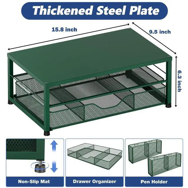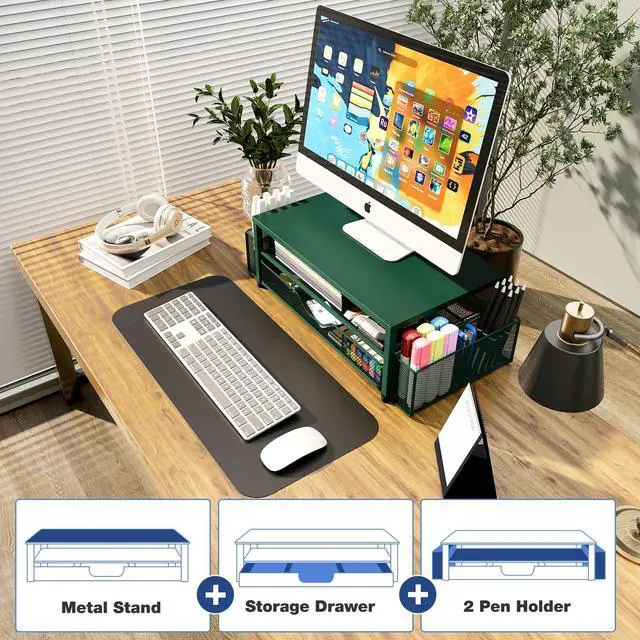 Ergonomic DesignOPNICE newly releases the monitor stand for desk organizer! This computer stand elevates your monitor or laptop to a comfortable viewing height, relieving pressure on your neck, shoulders. Ideal for strengthening office organization and increasing comfort levels ^^ Save SpaceThis 2-Tier monitor stand with drawer and 2 hanging pen holders provides ample storage space to keep your office supplies and office desk accessories neatly organized and easily accessible, keeping your workspace tidy and improving your sense of well-being ^^ Durable and StableThe metal computer stand is made of high quality material with sturdy construction, it can easily carry the weight of the display and computer accessories, to ensure stable and non-shaking for a long time, ideal for use in the office, dorm room or home ^^ Sleek and AestheticThis desktop organizer features a modern minimalist design that blends seamlessly with any office decor.