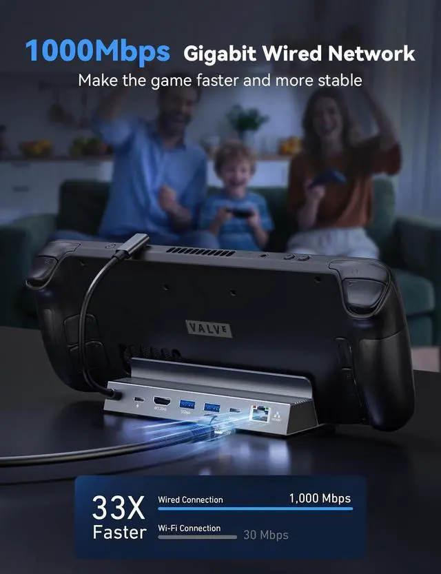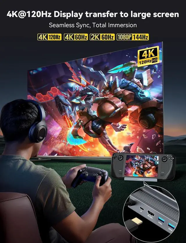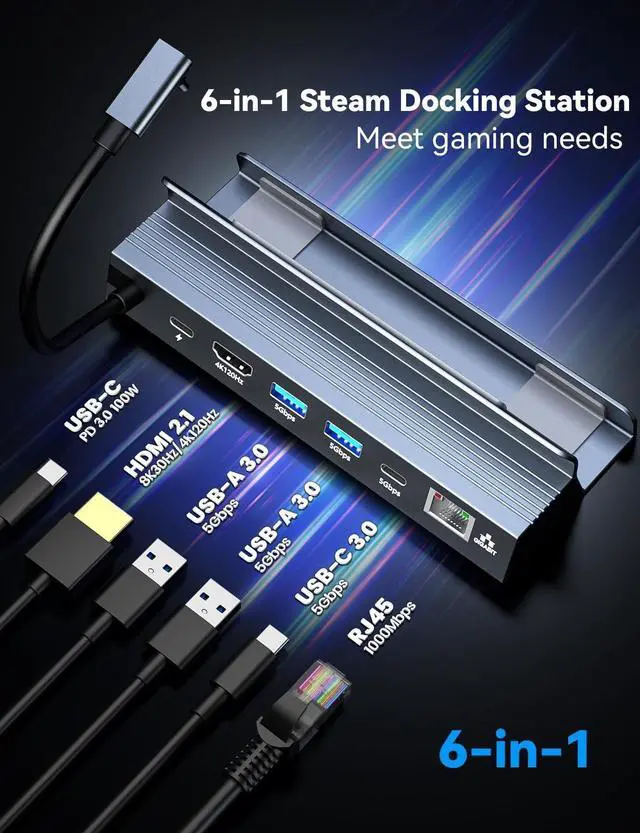 Gaming Docking Station: Maximize Productivity & Gaming Engineered for Steam Deck, Switch 2, and USB-C devices, featuring 2.1 port (8K30/4K120Hz), a 1Gbps Gigabit Ethernet port, two USB-A 3.0 (5Gbps) ports, a USB-C PD 3.0 (100W) charging port, and a USB-C 3.0 (5Gbps) data port.:, ( ). * +. ^^ 4K@120Hz