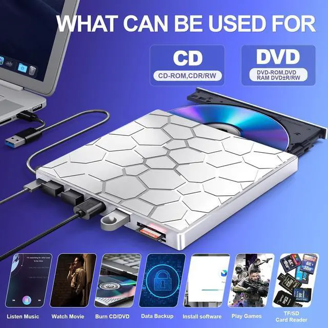 PROBLEMS SOLUTIONSIf your Windows 10/11 laptop PC cannot recognize this CD/DVD drive, Please connect the extra power cable to solve the problem of unrecognized caused by insufficient power supply. or you might find a solution by searching for "AyPhnwzyuoI" on YouTube. There are repair methods shown in the video that may help If it is not solved, reach out to us for a driver troubleshooting tool, the download link is not allowed here. ^^ 8 IN 1 Optical Drive Our portable DVD player is not only a CD/DVD reader, but also a CD/DVD burner, including 1 port USB 3.0 hub, 3 USB 2.0 port, SD or TF card reader and 1 USB-C Port, is perfect for transferring photo and video files from your camera by cards to your computer.